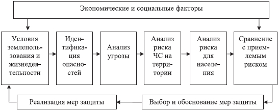 С учетом изменившегося аналитического научно-методического аппарата управление природными рисками в масштабе страны или на конкретной территории целесообразно осуществлять по схеме: идентификации опасностей - анализ (оценка и прогноз) угрозы - анализ риска ЧС на территории - анализ индивидуального риска для населения - сравнение с приемлемым риском - выбор, обоснование и реализация рациональных мер защиты (рис. 1.2.1) . Таким образом, на основе анализа рисков в итоге выбираются рациональные меры защиты от воздействия природных бедствий. При этом вначале анализ проводится с целью определения риска разрушения отдельных объектов социальной и хозяйственной инфраструктуры и риска стихийных бедствий на территории в целом, а затем - природных рисков для населения исследуемой территории.