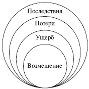 Техногенные и природные чрезвычайные ситуации вызывают последствия, которые в зависимости от их масштаба могут проявляться в различных сферах жизнедеятельности личности, общества и государства в целом. Последствия могут проявиться как непосредственно после чрезвычайной ситуации, так и на протяжении относительно длительного периода времени. В общем случае воздействия природных и техногенных чрезвычайных ситуаций могут привести к следующей цепочке: последствия - потери - ущерб - возмещение. Качественное соотношение между элементами цепочки показано на рис. 5.1.1.