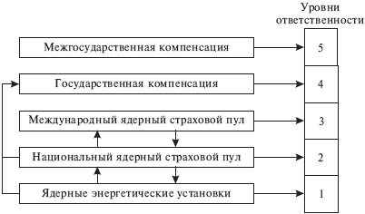 Примером реализации многоуровневой системы возмещения ущерба, включающей различные механизмы, может служить система, реализованная в ядерной энергетике большинства развитых стран мира. Различные варианты такой системы начали формироваться в середине 50-х годов XX века одновременно с развитием коммерческой ядерной энергетики. Несмотря на разный уровень социально-экономического развития, система возмещения ущерба от аварий на объектах ядерной энергетики в различных странах включает примерно одни и те же составляющие: самострахование (объектный резерв), страхование, перестрахование, государственная и межгосударственная компенсация. Обобщенная схема такой системы показана на рис.