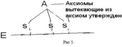 «А» - это аксиомы, которые предположительно получаются на основе полученных данных «Е». Но полной логической связи между «А» и «Е» не существует. Есть только интуитивная догадка. Из аксиом «А» исследователь выводит частные утверждения «S». Эти утверждения проверяются экспериментом. В какой-то степени «S» совпадают с опытными данными, но, как правило, не полностью. Исследователь вынужден добывать новые факты. С учетом новых фактов выводятся новые утверждения «S» и т.д., до тех пор, пока утверждения будут близки опытным данным.