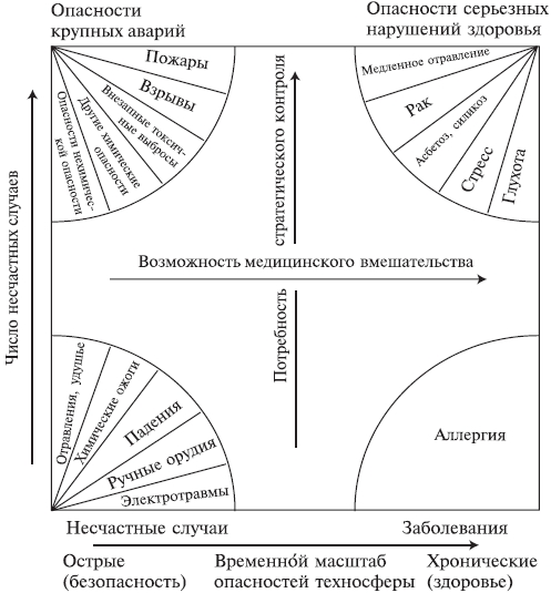Некоторые основные выводы. Опасности - многоаспектное явление, и трудно, а подчас и невозможно, рассматривать одни составные части опасности в отрыве от других. Необходимо иметь представление о том, каких последствий следует ожидать, насколько велика угроза для окружающей природной среды и для общества. Рис. 1.4.1.1, построенный В.Маршаллом [38], представляет взаимосвязь между временным масштабом опасностей техносферы и числом несчастных случаев. Его можно рассматривать как наглядную иллюстрацию различий между групповыми и одиночными несчастными случаями, групповыми профессиональными заболеваниями. Видно, например, повышение значения медицинского вмешательства с увеличением временного масштаба. Рисунок одновременно указывает на связь опасностей и риска. Опасность одиночных несчастных случаев низка (поскольку пострадавший всегда один), однако риск велик. Для групповых несчастных случаев имеет место противоположная закономерность. Аналогично одиночные заболевания (когда заболевает лишь малая доля пострадавших) присущи малым опасностям с высоким риском, тогда как для групповых заболеваний (вспышек) опасность велика, а риск мал (из-за длительности между периодами заражения ввиду редких событий).