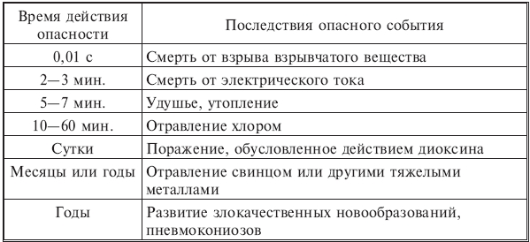 Таксономия по времени реализации. В медицине издавна используются термины "острый" и "хронический" для описания характера заболевания: быстро развивающуюся и бурно протекающую болезнь называют "острой", медленно развивающаяся и долго текущая болезнь обозначается как хроническая. В медицине никогда не придавалось точного значения понятиям "быстро" и "медленно". С медицинской точки зрения понятия "острый" или "хронический" никоим образом не связывалось с тяжестью заболевания, такое понимание этих терминов сохранено при рассмотрении опасностей. Легко видеть, что термины "острый" и "хронический" отвечают противоположным полюсам некоего диапазона значений; провести строгую разделительную черту между ними весьма непросто. Термин "острая" будет относиться к опасностям, для которых время проявления действия не превышает часа. Опасность будет называться "хронической", если ее реализация занимает более месяца. Опасности, срок реализации которых находится внутри обозначенного интервала, будут рассматриваться как нечто среднее между острыми и хроническими опасностями. Табл.1.1.4.1 иллюстрирует использование такой классификации. Под временем действия опасности понимается период, в течение которого зарождаются, развиваются и действуют поражающие факторы.