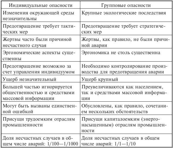 Таксономия опасностей по числу пораженных. Идея этой классификации - качественная характеристика индивидуальных и групповых опасностей. Значимые качественные различия между этими классами опасностей (несмотря на существование количественной близости между ними) отражены в табл.1.4.1.2. Эти различия могут быть положены в основу регулирования и выявления основных опасностей - в отличие от прочих.