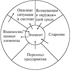 Опасные состояния вызываются одним или несколькими элементами, приводящими к отказам в системе. Окружающая среда, персонал, старение могут влиять на систему только через ее элементы (рис.5.1.1.).