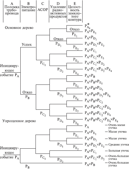 ПРИМЕР. Допустим, путем выполнения ПАО было выявлено, что критической частью реактора, т.е. подсистемой, с которой начинается риск, является система охлаждения реактора; таким образом, анализ начинается с просмотра последовательности возможных событий с момента разрушения трубопровода холодильной установки, называемого инициирующим событием, вероятность которого равна PA (рис. 6.9.1), т.е. авария начинается с разрушения (поломки) трубопровода - событие A. Далее анализируются возможные варианты развития событий (B, C, D и E), которые могут последовать за разрушением трубопровода. На рис. 6.9.1 изображено дерево исходных событий, отображающее все возможные альтернативы. На первой ветви рассматривается состояние электрического питания. Если питание есть, следующей подвергается анализу аварийная система охлаждения активной зоны реактора (АСОР). Отказ АСОР приводит к расплавлению топлива и к различным, в зависимости от целостности конструкции, утечкам радиоактивных продуктов.