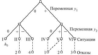 Соответствие между ситуациями и отказами отражается на дереве состояний (рис. 6.14.1). При его построении из начальной вершины (нулевой уровень) проводят ребра, соответствующие значениям переменной y1, из вершины следующего уровня - значениям переменной y2. после рассмотрения всех переменных образуются вершины, соответствующие возможным ситуациям, они пунктиром связаны с отказами объекта.