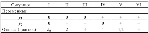 Например, в аппарате контролируются давление (y1) и температура (y2). Переменная y1 может находиться на двух уровнях: "0" - нормальное значение, "+" - завышенное значение, а переменная y2 на трех уровнях: "0", "+" и "-" (заниженное значение). В этом случае число возможных ситуаций равно шести (2(3): ситуация 1 - y1=0, y2=0, т.е (0;0); ситуация II - (0;+) и т. д. (табл. 6.14.1). Основные нарушения элементов объекта: 1 - отказ регулятора давления, 2 - отказ регулятора температуры, 3 - отказ регулятора расхода, 4 - не подается пар в рубашку.