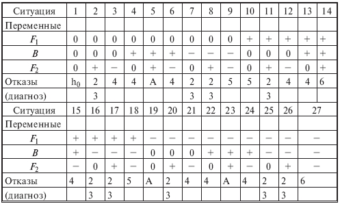 Некоторые ситуации соответствуют одним и тем же отказам, их можно объединить. Так, в ситуациях 2, 11, 20 при различных значениях F1 одинаковый вывод - нарушения 2, 3. Это позволяет объединить три ситуации, отметив значение F1 знаком Л - любое. Результаты объединения ситуаций приведены в табл. 6.14.2.
