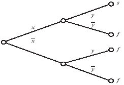 ПРИМЕР. Оператор выполняет два задания - сначала x, а затем y. При этом он может выполнять их как правильно, так и неправильно. Другими словами, неправильно выполняемые задания - единственные ошибки, которые могут появляться в данной ситуации. Требуется построить дерево возможных исходов и найти общую вероятность неправильного выполнения задания. Предполагается, что вероятности статистически независимы.