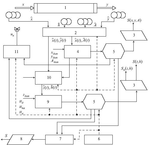 После преобразования сигналов от датчиков в унифицированную форму (блок 2) значения x(t), y(t),A(t) сопоставляют с допустимыми для нормальной работы (блок 4), т.е. проверяют выполнение условий x(t) Хдоп, y(t) Yдоп, A(t) Адоп, где Хдоп, Yдоп, Адоп - области допустимых значений соответственно х, y, А. Если какое-либо условие не выполняется, то в блоке 5 принимается решение о выдаче сигнала тревоги S(х, у, А), а также выработке корректирующих воздействий управляющими устройствами (блок 11). В блоке 10 по данным о x(t), y(t), а иногда и отдельных значений h(t), оценивают вектор фазовых координат z(t) и переменную состояния функционирования h(t). Значения z(t) и h(t) сопоставляют с допустимыми (блок 9), т.е. проверяют условия z(t) Zдоп, h(t) Нд. В блоке 5 анализируется текущее состояние системы в случае опасности и выдается сигнал предупреждения Sп(z, h) или тревоги, S(z, h) блоком 3. Блоком 7 производится диагностика имеющихся нарушений, а блоком 6 - проверка работоспособности системы обеспечения безаварийности с помощью специальных тестов.