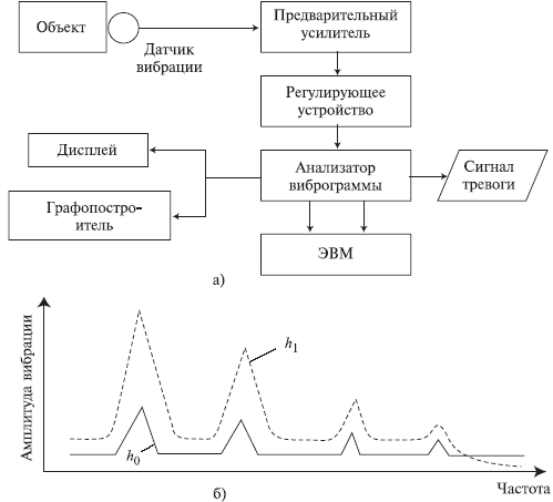 Анализ вибрации машин и аппаратов позволяет получить важную информацию о процессах в различных механических устройствах, связанных с вращением, качением, скольжением, движением жидкостей, газов, сыпучих материалов и т.д. В настоящее время разработаны датчики вибраций, методы и устройства получения частотного спектра - виброграмм. Схема системы контроля вибраций приведена на рис. 9.7.3,а. Расположение дискретных частот виброграммы и их амплитуды позволяют определять состояние работоспособности системы, обнаруживать зарождающиеся отказы, связанные, например, с износом. Характерный вид виброграмм для различных состояний функционирования показан на рис. 9.7.3,б.