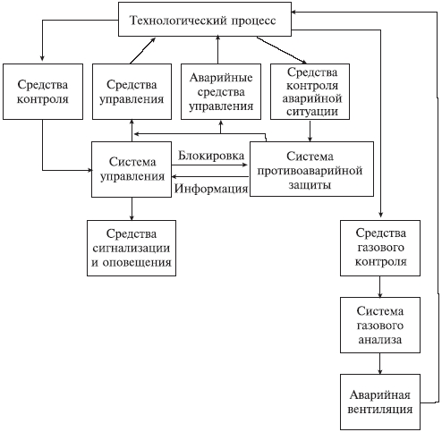 Надежность системы ПАЗ увеличивает также и то, что она контролирует состояние небольшого количества параметров по независимым от системы управления каналам и обрабатывает информацию по более простому алгоритму. При появлении информации, которая специальным логическим устройством расшифровывается как предварительная, система вырабатывает управляющее воздействие; оно должно вывести процесс из предварительного состояния и по определенной программе произвести аварийный останов. Система ПАЗ управляет при этом штатными ИМ или специальной быстродействующей аварийной ИМ. Бесконфликтность с СУ обеспечивается блокировкой ее со стороны выхода системы ПАЗ на период проведения операции, остановка которых может привести к взрывам. По окончании такой операции блокировка снимается.