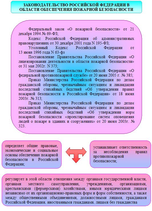В начале раскрытия этого вопроса необходимо отметить, что права и обязанности организаций в области пожарной безопасности регулирует Федеральный закон «О пожарной безопасности», а ответственность за нарушения в области пожарной безопасности регламентируют Кодекс Российской Федерации об административных правонарушениях и Уголовный Кодекс Российской Федерации.