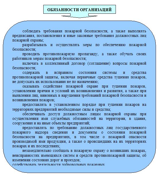 В соответствии с частью 2 статьей 37 Федерального закона «О пожарной безопасности» организации в лице своих руководителей обязаны: