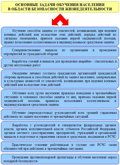 В соответствии с нормативной правовой базой по организации и осуществлению обучения населения в области безопасности жизнедеятельности основными задачами обучения населения в области безопасности жизнедеятельности являются: