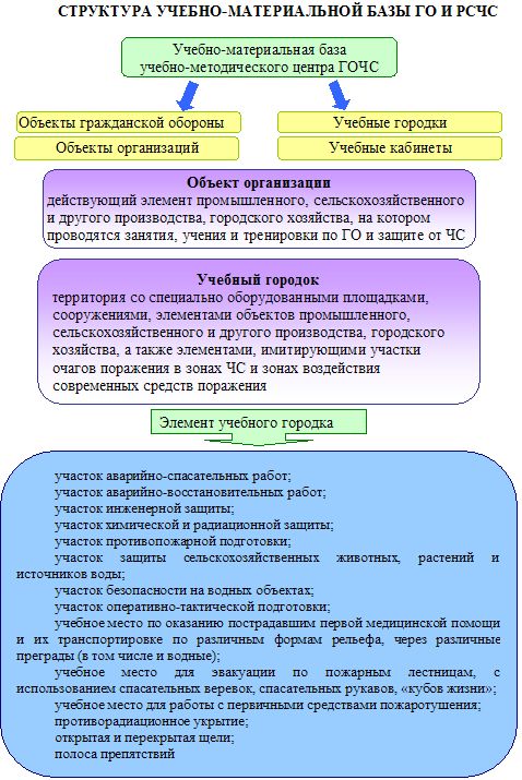 Объекты гражданской обороны наряду с их прямым назначением могут являться объектами учебно-материальной базы. В качестве объектов учебно-материальной базы подбираются образцово содержащиеся и не сдаваемые в аренду убежища и противорадиационные укрытия, специализированные складские помещения для хранения имущества гражданской обороны, санитарно-обмывочные пункты, станции обеззараживания одежды и транспорта, имеющие необходимое оборудование, аварийно-спасательный инструмент, средства связи и оповещения, положенную документацию. Они используются при изучении порядка применения средств коллективной защиты, хранения имущества ГО, проведения санитарной обработки и других вопросов.