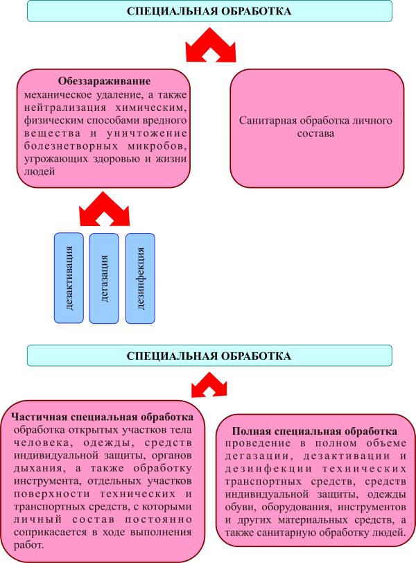 Специ альная обработка включает обеззараживание поверхностей и санитарную обработку личного состава. Обеззараживание предусмат ривает прежде всего механическое удаление, а также нейтрализа цию химическим, физическим способами вредного вещества и уничтожение болезнетворных микробов, угрожающих здоровью и жизни людей, и включает в себя выполнение таких работ, как де зактивация, дегазация, дезинфекция средств индивидуальной защиты, одежды, предметов постоянного пользования, инструментов, технических и транспортных средств.