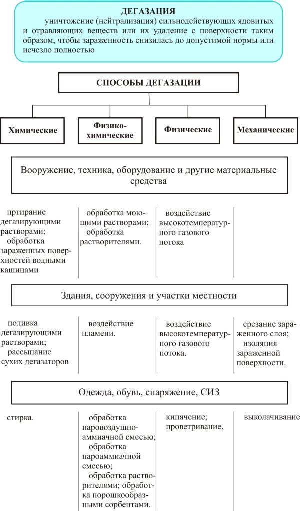 Дегазация одежды, обуви, средств индивидуальной защиты осуществляется, в основном, кипячением, обработкой пароамми ачной смесью, стиркой и проветриванием.
