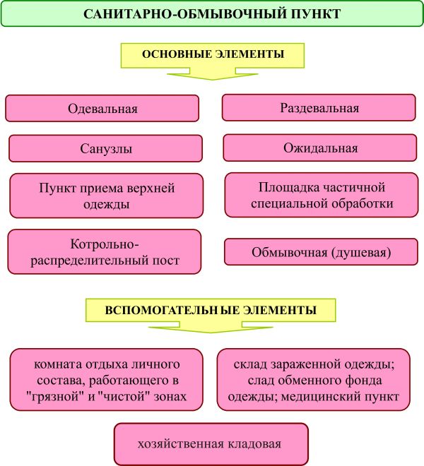 склад зараженной одежды; слад обменного фонда одежды; медицинский пункт;