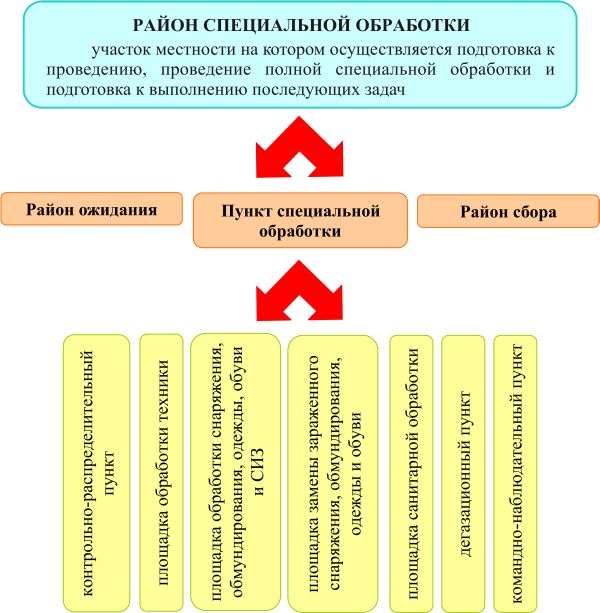 Специ альная обработка включает обеззараживание поверхностей и санитарную обработку личного состава. Обеззараживание предусмат ривает прежде всего механическое удаление, а также нейтрализа цию химическим, физическим способами вредного вещества и уничтожение болезнетворных микробов, угрожающих здоровью и жизни людей, и включает в себя выполнение таких работ, как де зактивация, дегазация, дезинфекция средств индивидуальной защиты, одежды, предметов постоянного пользования, инструментов, технических и транспортных средств.