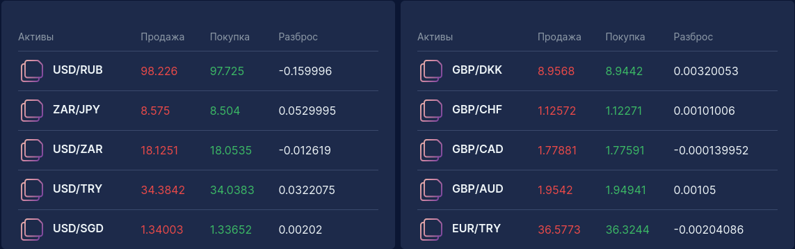Финансовый Forex брокер DotBig предлагает трейдерам фиатные пары со спредами от 0 пунктов. Торговать можно по различным направлениям, включая USD/RUB, ZAR/JPU, USD/ZAR, USD/SGD. В рамках обслуживания клиентов финансовый аналитик Марго Пажинская проводит консультирование. Эксперт составляет индивидуальное инвестиционное портфолио и подбирает торговые стратегии, которые принесут доход пользователю. Разработка планов осуществляется с учетом предпочтений клиента.