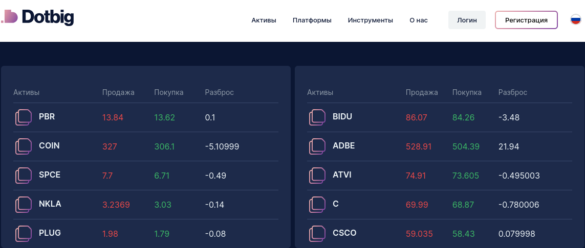 Форекс биржа DotBig предлагает трейдерам доступ к покупке и продаже акций крупных компании из различных сфер. Например, можно торговать контрактами на разницу цен технологических корпораций, транспортных или продуктовых компании. На бирже размещены акции компаний, которые занимаются добычей энергоресурсов и производством элементов электроснабжения.