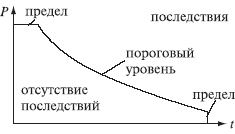 Организмы и растения способны без вреда для себя переносить воздействие опасностей в определенных количествах, например, загрязняющих веществ, теплового излучения, вибрации. Их уровень, ниже которого болезненные реакции не наблюдаются, называют пороговым уровнем. При больших количествах проявляются отрицательные воздействия. Они зависят от величины опасной дозы (P), так и от длительности воздействия (экспозиции) опасности (t). При короткой экспозиции (малой длительности) переносимы более высокие уровни, т.е. пороговые значения для них могут быть выше и понижаться при более длительной экспозиции (рис.