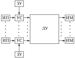 Сигналы от измерительных преобразователей (ИП) поступают на анализаторы параметров процесса, представляющие собой устройства сравнения (УС). Одновременно с этим на анализаторы поступают допустимые значения параметров процесса от задающего устройства (ЗУ). Если какой-нибудь параметр оказался больше (или меньше) своего допустимого значения, то с соответствующего анализатора поступает сигнал в узел управляющих воздействий (УУВ), где происходит выбор управляющих (защитных) воздействий (УВ); сигналы с УУВ поступают к объекту управления через исполнительный механизм (ИМ). Исполнительных механизмов может быть несколько.