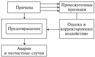 Помимо рассмотренного метода используются методы, способствующие выявлению критических точек системы, могущих вызвать отказ системы (элемента) или обусловить аварийное состояние производства. Эти методы (чаще - их комбинация) относятся к группе качественных методов оценки опасности, основанных на изучении состояния условий эксплуатации системы (объекта) или проекта действующим требованиям промышленной безопасности. Они дают представления об отклонениях от нормы и могут служить основой для более подробных (в т.ч. и численных) методов анализа, позволяют выработать корректирующие воздействия не только со стороны системы контроля и управления безопасностью, но и внести коррективы в технологический процесс или модернизировать систему. Метод использует промежуточные признаки состояния системы и способствует предотвращению опасных событий. На рис. 6.3 приводится схема использования промежуточных признаков для предотвращения развития опасной ситуации, приводящей в последствии к авариям и несчастным случаям. В плане методического содержания эту схему можно применить к любому производству. В каждом конкретном случае могут изменяться признаки. Опытный специалист по безопасности может заметить промежуточный признак, который не виден лицу, эксплуатирующему оборудование, так же как и оператор технической системы или технолог могут увидеть отклонения от нормы, которые не понятны специалисту по безопасности. Например, в качестве промежуточного признака может выступать излишняя вибрации, шум в отдельных частях агрегата и др.