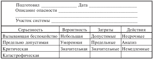 На карте проставляется дата, что дает возможность устанавливать хронологи выявления (развития) опасностей, указывается подразделение (цех, участок, подсистема, агрегат и пр.), что дает возможность проследить топографию опасностей. Остальная часть разбита на четыре рубрики. Каждая из них представлена несколькими категориями. Категории располагаются так, что те из них, которые требуют наибольшего внимания при анализе, находятся внизу перечня. Например, если серьезность опасности катастрофическая, вероятность аварии - неминуемая, а затраты - номинальные, то необходимо немедленное действие.