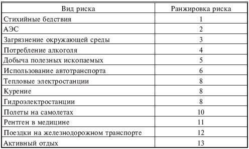 Характерный пример: эксперимент, поставленный сотрудниками Всесоюзного научно-исследовательского института системных исследований (ВНИИСИ), был направлен на выявление особенностей субъективного представления людей о степени риска, связанного с различными видами деятельности. Он предполагал ранжирование испытуемыми тринадцати видов риска. Первое место по степени риска для общества (социального риска) в обобщенной ранжировке заняли стихийные бедствия, второе - АЭС, а последнее - поездки на железнодорожном транспорте и активный отдых (см. табл.