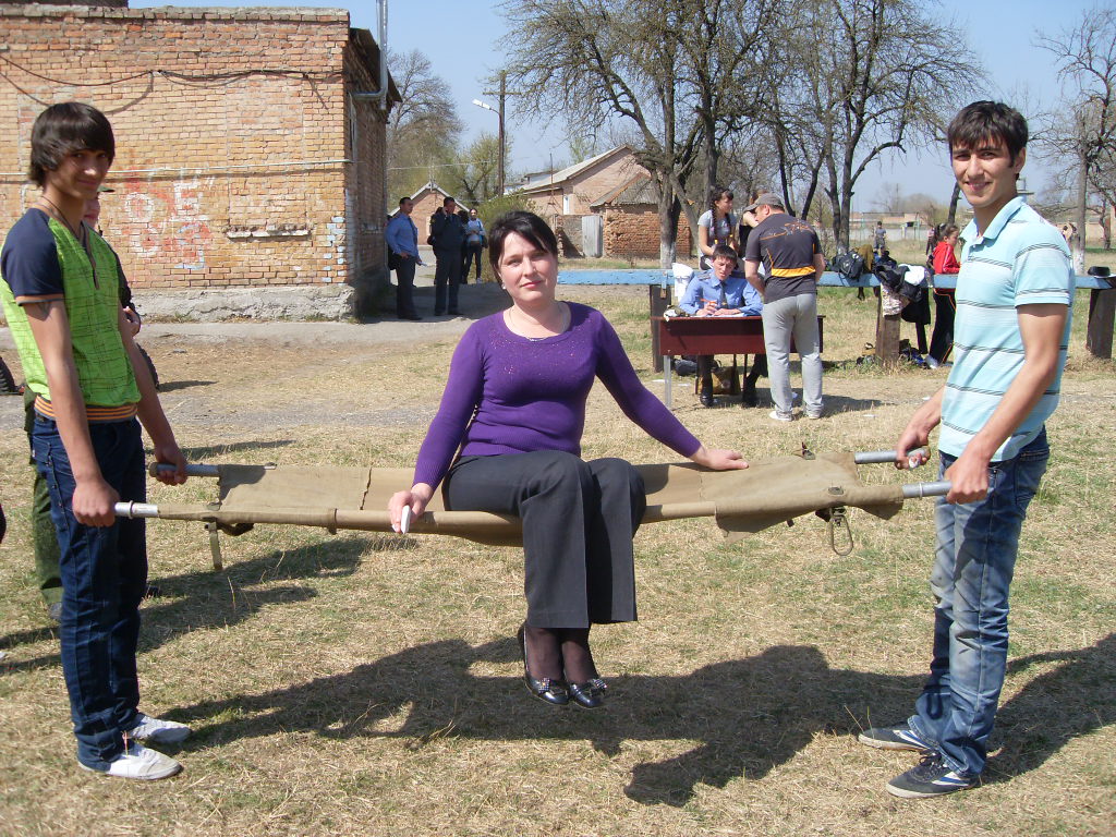 Участники команды берут на выбор карточку с заданием у судьи. В карточке указывается вид травмы и имеются теоретические вопросы. Участники имитируют процесс оказания доврачебной помощи, отвечают на теоретические вопросы. Затем команда изготавливает из подручных материалов носилки и транспортирует «пострадавшего»