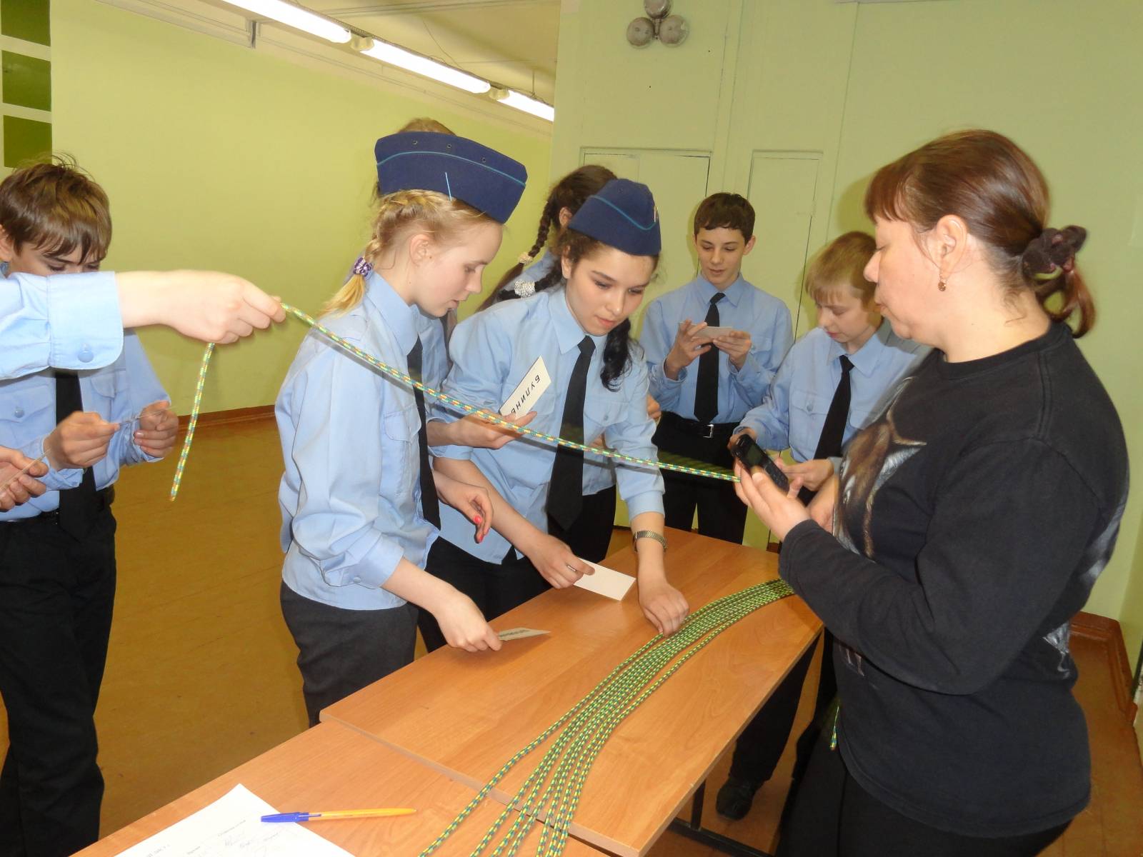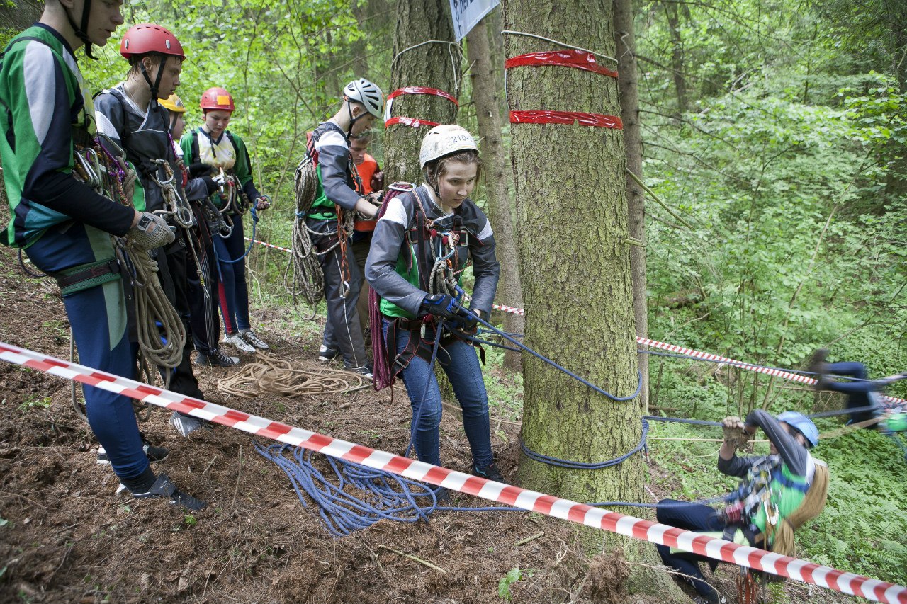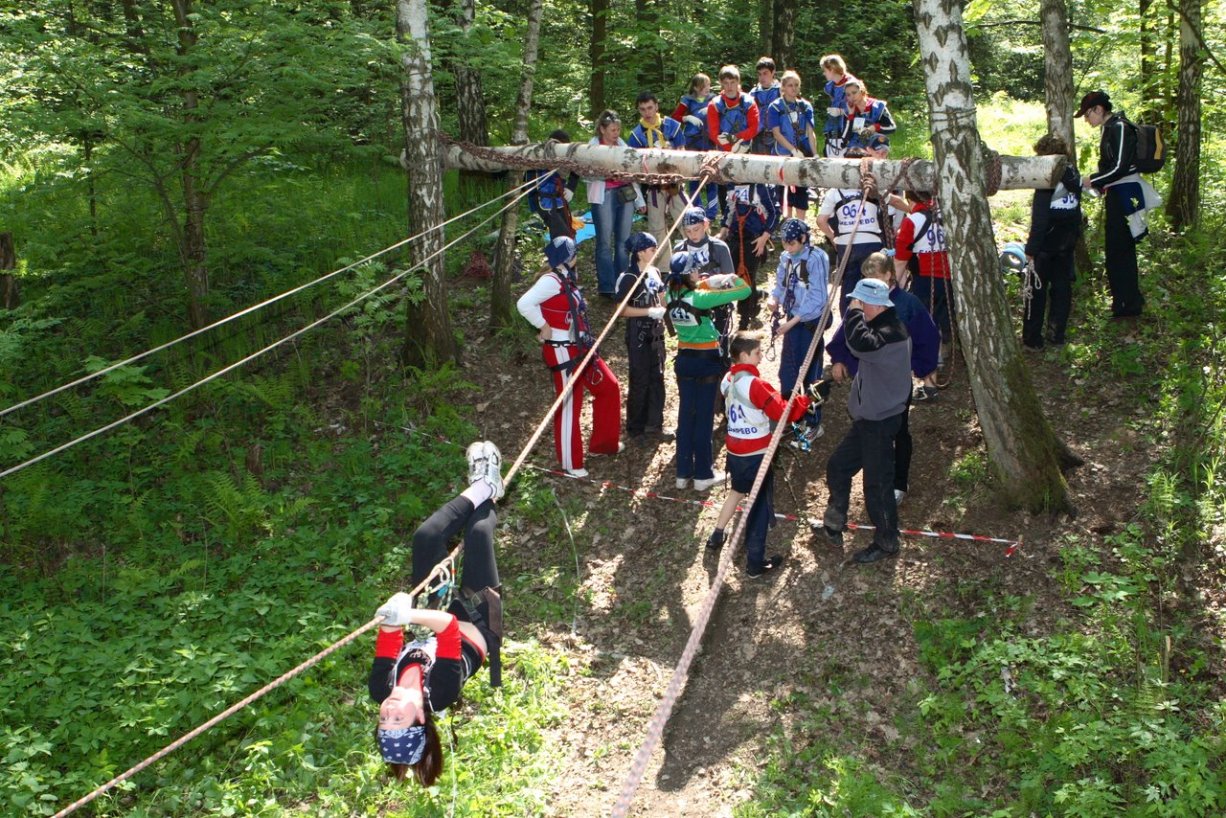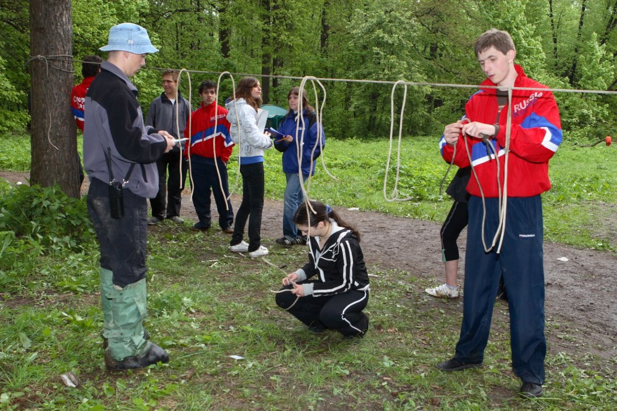 1. После приёма эстафеты поднимается и спускается по веревке с узлами. При спуске на веревке находится только один участник.