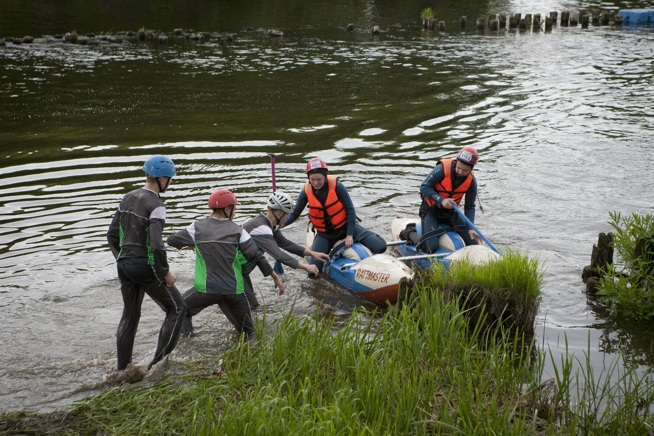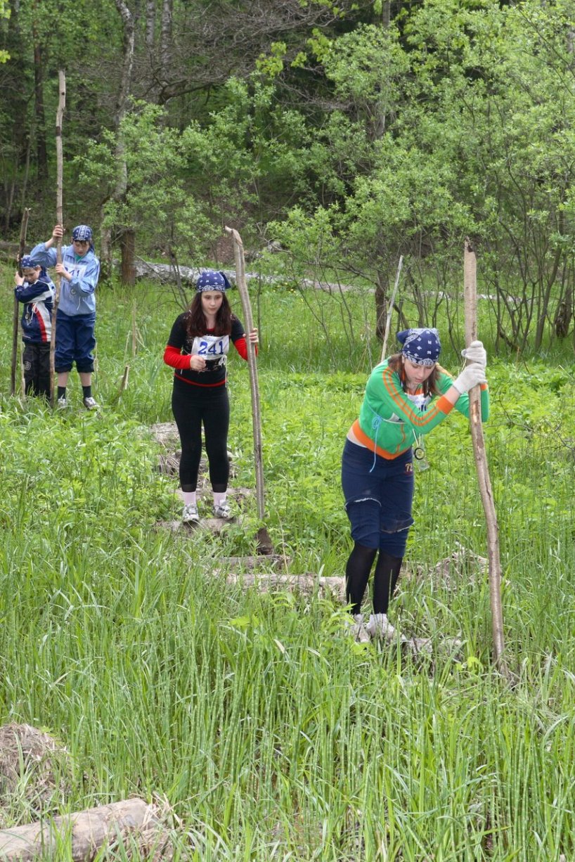 Команда укладывает бревно через препятствие и переправляется на другой берег