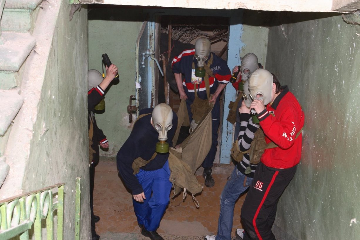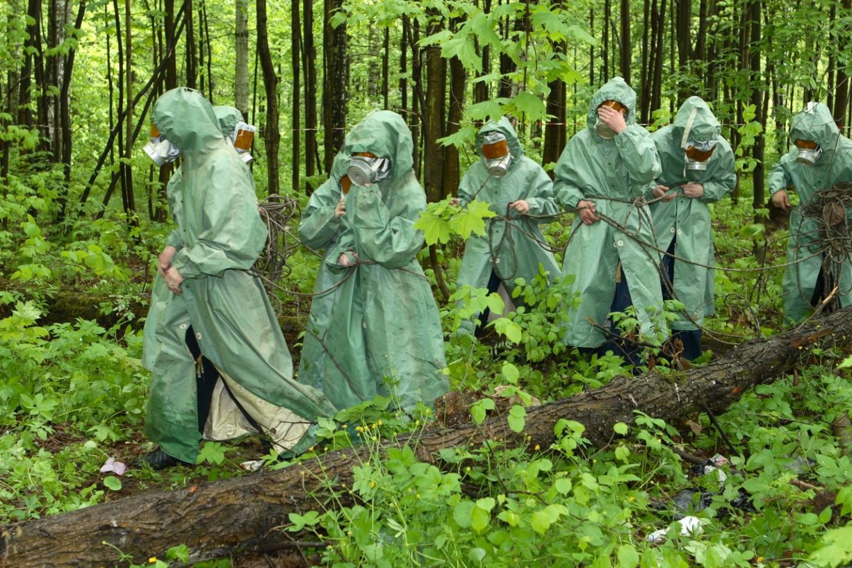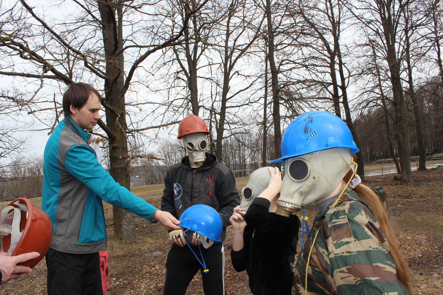 После получения судейской информации об угрозе поражения АХОВ и времени подхода зараженного облака команда оценивает обстановку и, используя подручные средства защиты органов дыхания, выходит из зоны заражения.