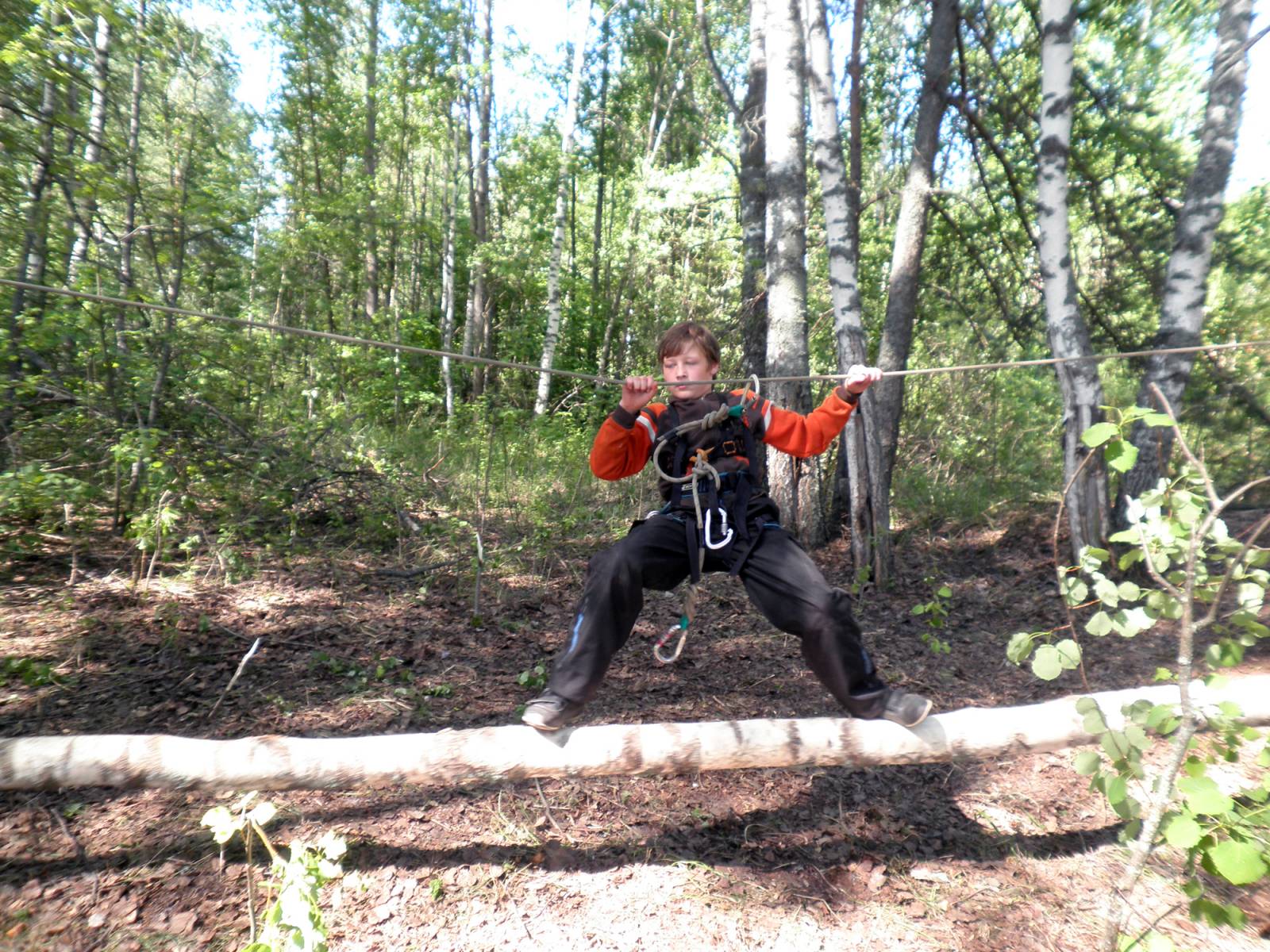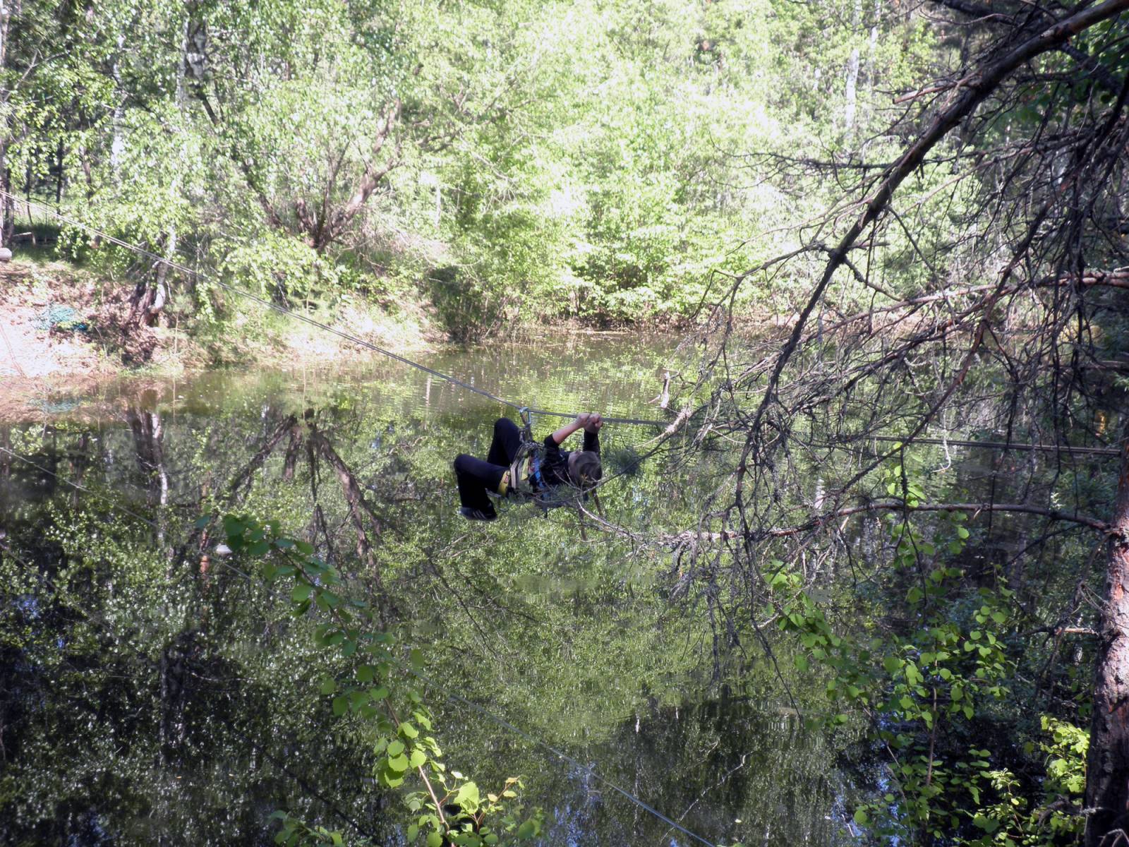 Переправиться на другой берег, идя по нижней веревке и держась за верхнюю, используя самостраховку
