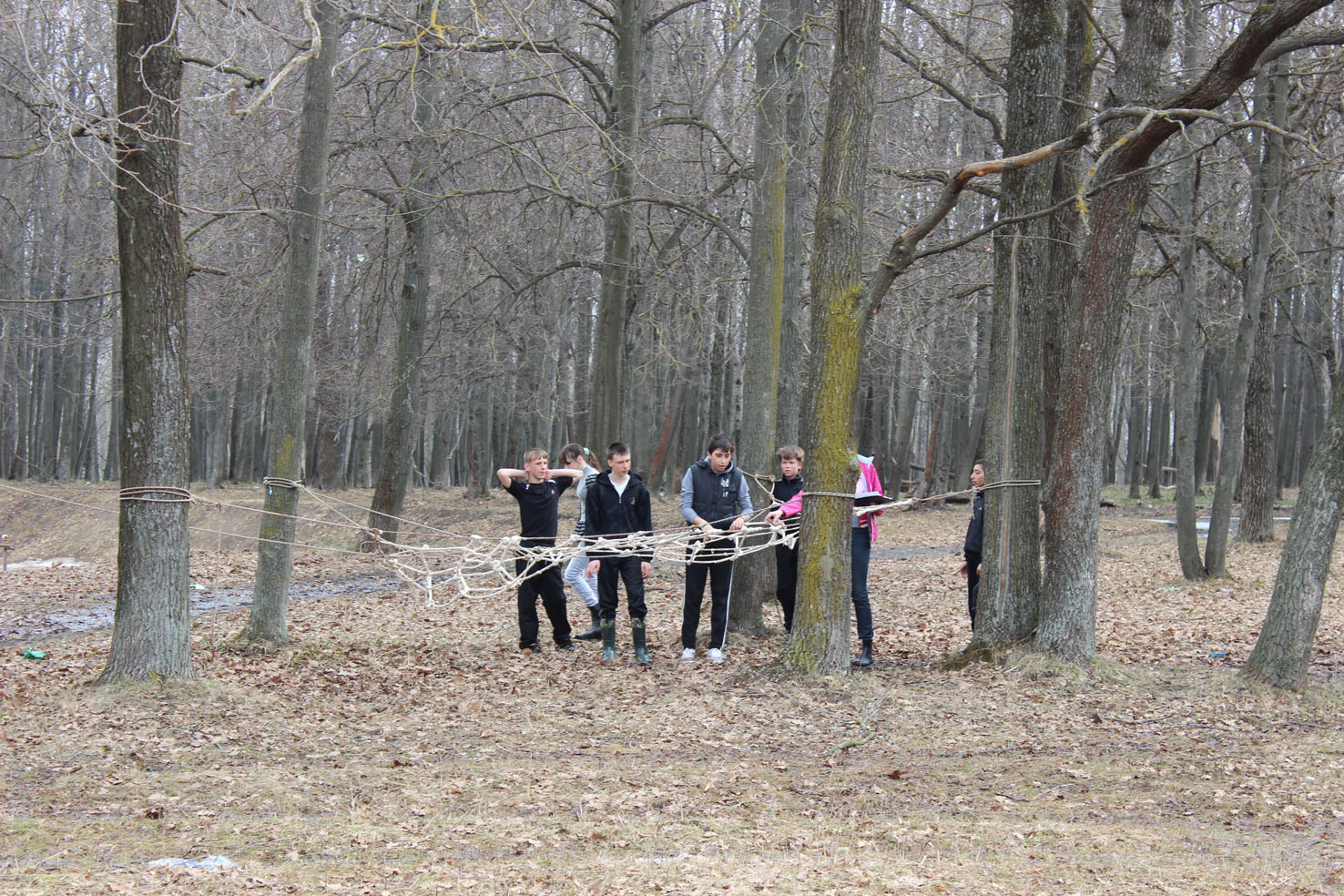 3. «Завал» – первый участник, преодолевший «мышеловку», подползает к завалу в виде щита и подает звуковой сигнал (стук любым твердым предметом о внутреннюю сторону щита). Четвертый участник, услышав сигнал, поднимает щит параллельно земле и подставляет под него с двух сторон страхующие стойки. Помогает выбраться из-под завала первому, второму и третьему участнику группы. До установки стоек выходить из «мышеловки» группа не имеет права.