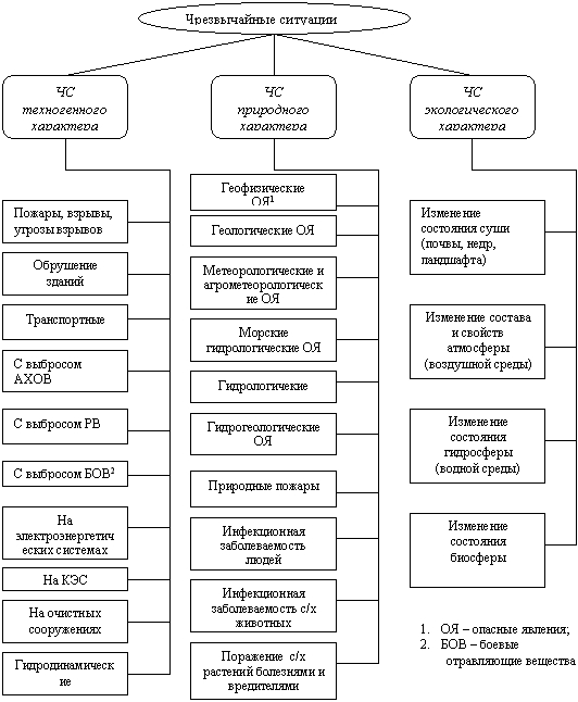 разрушительным или другим негативным воздействием на окружающую среду, приводящим к природному или техногенному бедствию различной интенсивности и масштаба - источнику чрезвычайной ситуации, обуславливающему возникновение чрезвычайной ситуации природного, техногенного или экологического характера. Как отмечалось выше, чрезвычайная ситуация - это обстановка на определенной территории, сложившаяся в результате аварии, опасного природного явления, катастрофы, стихийного или иного бедствия, которая может повлечь за собой человеческие жертвы, ущерб здоровью людей или природной среде, значительные материальные потери и нарушение условий жизнедеятельности людей. На рис.1.2.1