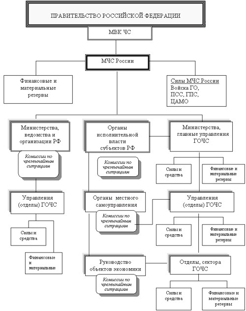 Прежде всего, она состоит в создании системы соответствующих организационных структур. В России на всех уровнях образованы органы управления, специально уполномоченные на решение задач в области защиты населения и территорий от чрезвычайных ситуаций природного и техногенного характера. Решениями Правительства Российской Федерации (постановления от 15 апреля 1992 г и от 5 ноября 1995 г. № 1113) создана единая государственная система предупреждения и ликвидации чрезвычайных ситуаций (РСЧС).