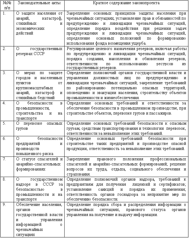Первый перечень законопроектов, подлежащих разработке на федеральном уровне в 1991г., подготовленный Государственной Комиссией Совета Министров СССР по чрезвычайным ситуациям, был утвержден еще постановлением Совета Министров СССР уже от 15 декабря 1990 г. № 1282 (табл.