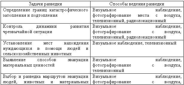 Основными способами ведения разведки при наводнениях являются: визуальный, фотографический, телевизионный, тепловизионный, радиолокационный. Соответствие способов ведения разведки решаемым задачам отражено в табл.