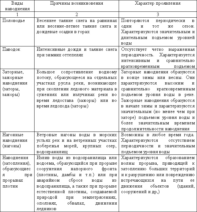 Виды наводнений вследствие возникновения и характера их проявления представлены в табл.3.5.2.