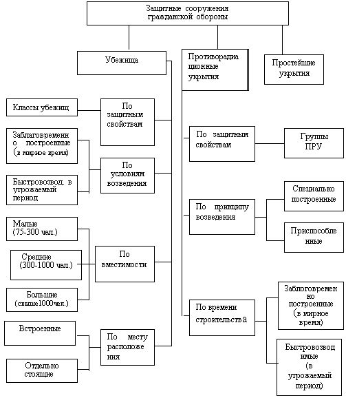 Следует отметить, что в целях защиты населения от чрезвычайных ситуаций успешно используются защитные сооружения гражданской обороны, классификация которых представлена на рис.