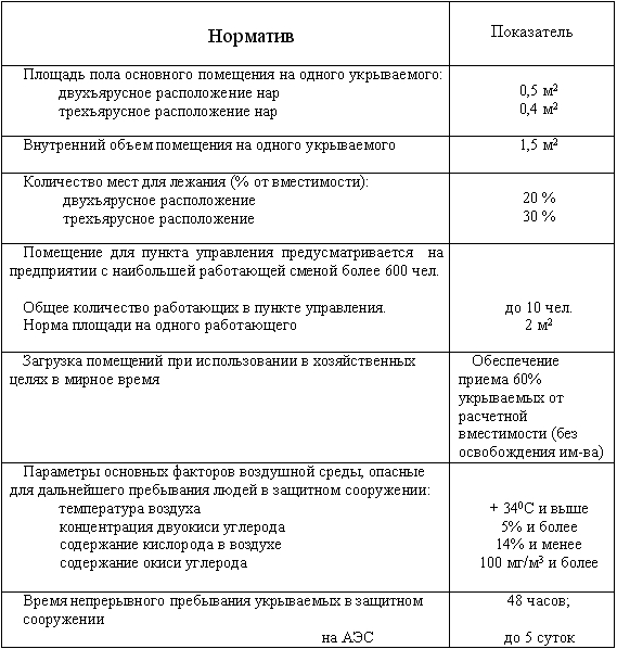 Основные санитарно-гигиенические нормы по проектированию и эксплуатации убежищ представлены в табл.4.3.1.