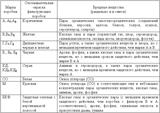 В зависимости от типа используемых в производстве опасных химических веществ промышленные противогазы выпускаются с различными фильтрующими коробками (табл.
