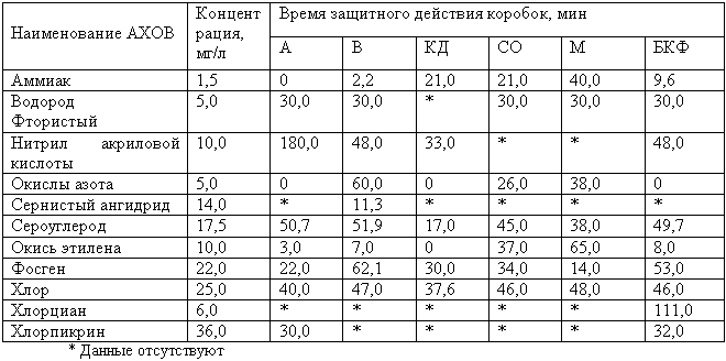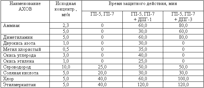 2. Для детских противогазов время защитного действия от АХОВ (при скорости воздушного потока 15 л/мин) составляет примерно в два раза больше указанного в таблице.